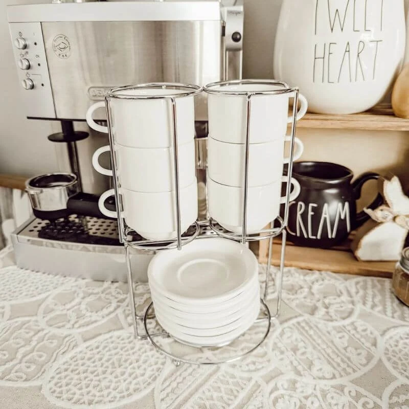 A Simple yet classy design that perfectly fits your espresso maker. Coming with Saucers and the great stacking stand.Β They have a cafe look that actually makes you feel as though you are in a coffee bar enjoying your brew.